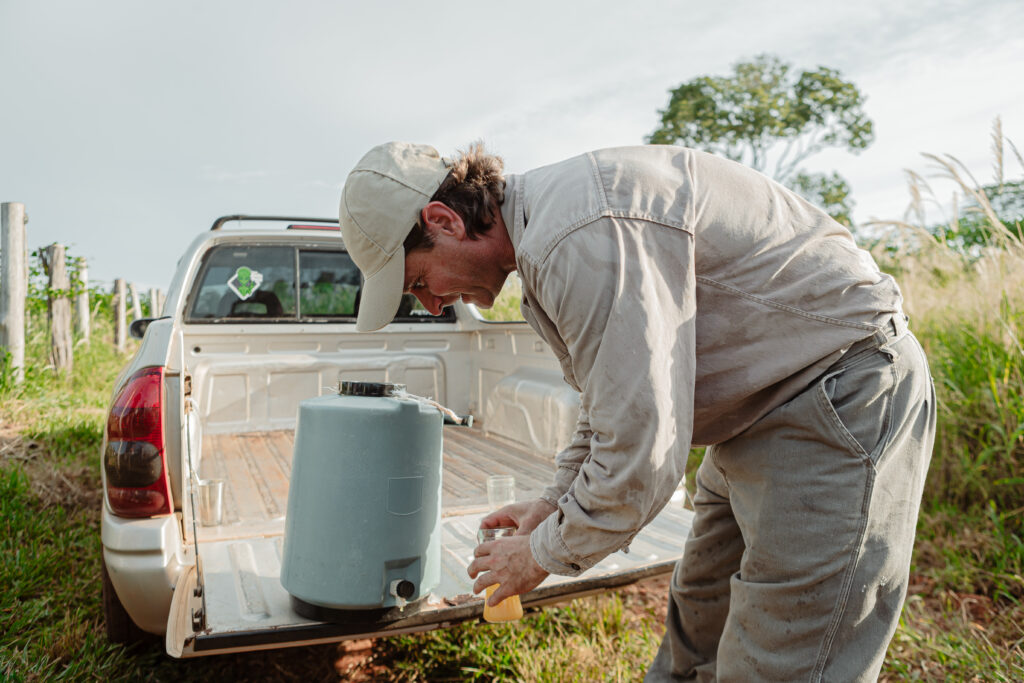 Productor rural prepara bioinsumos naturales desde la caja de una camioneta en medio del campo, en un entorno de vegetación y cielo despejado.